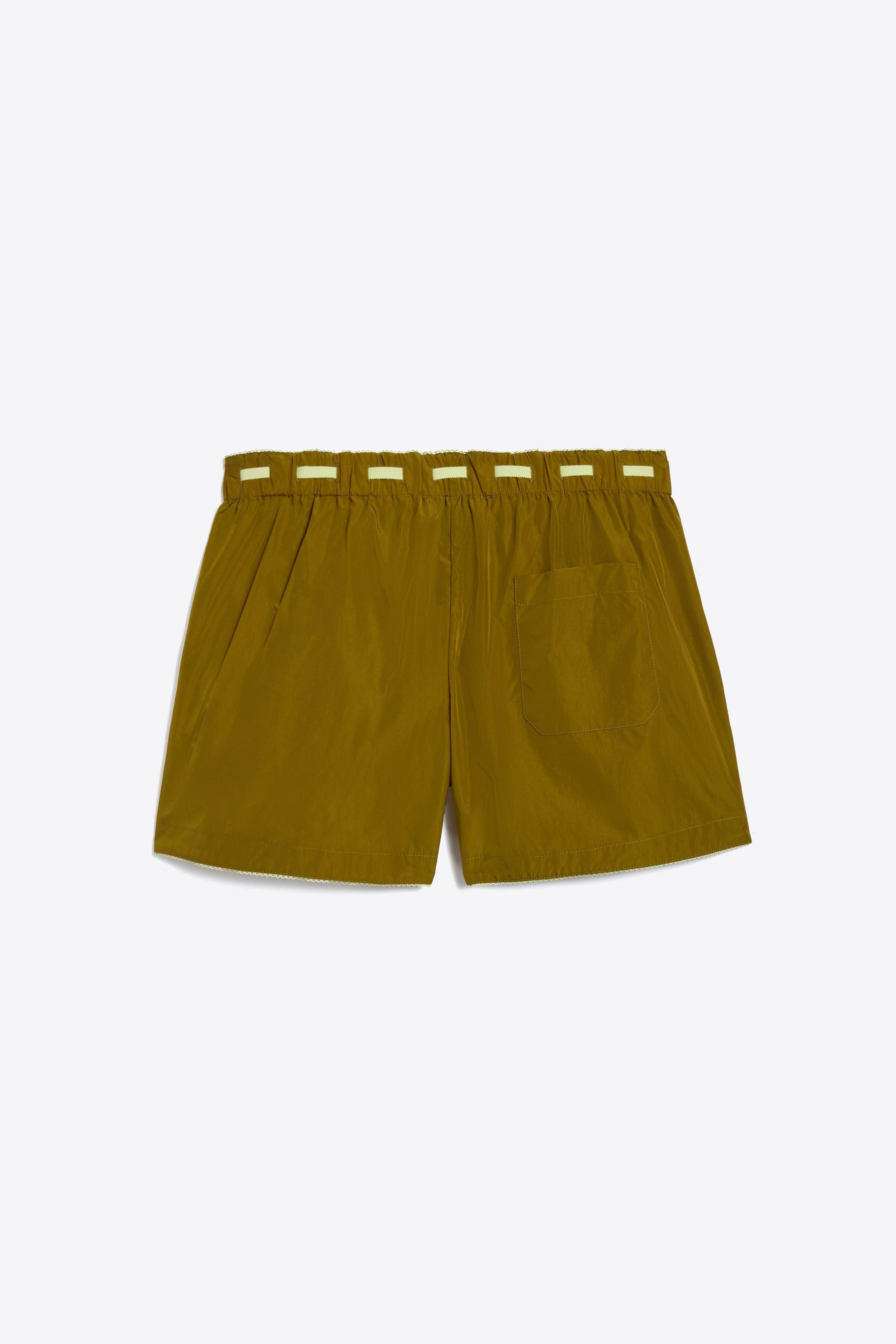 Athletic with a coquettish bent, these shorts subverts the nylon fabrication with laced through grosgrain ribbon and lace detailing at waistband and hem. 4" inseam with side entry pockets.
