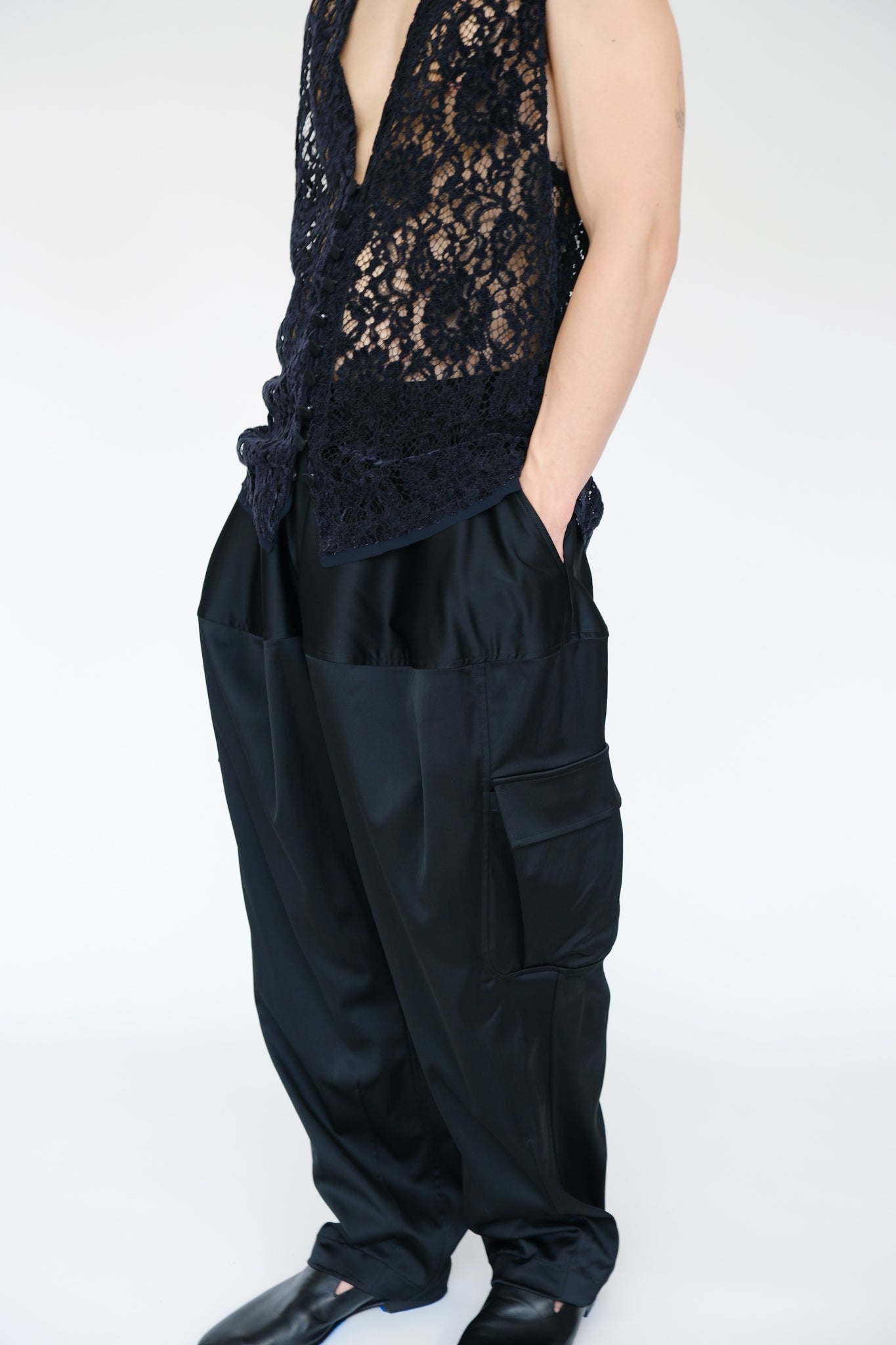 Our Twirl Cargo Trouser has a circular cut at the yoke that creates elegantly draped volume. Cut in technical satin with stretch, it has tailored waistband and cargo pockets detailing throughout.