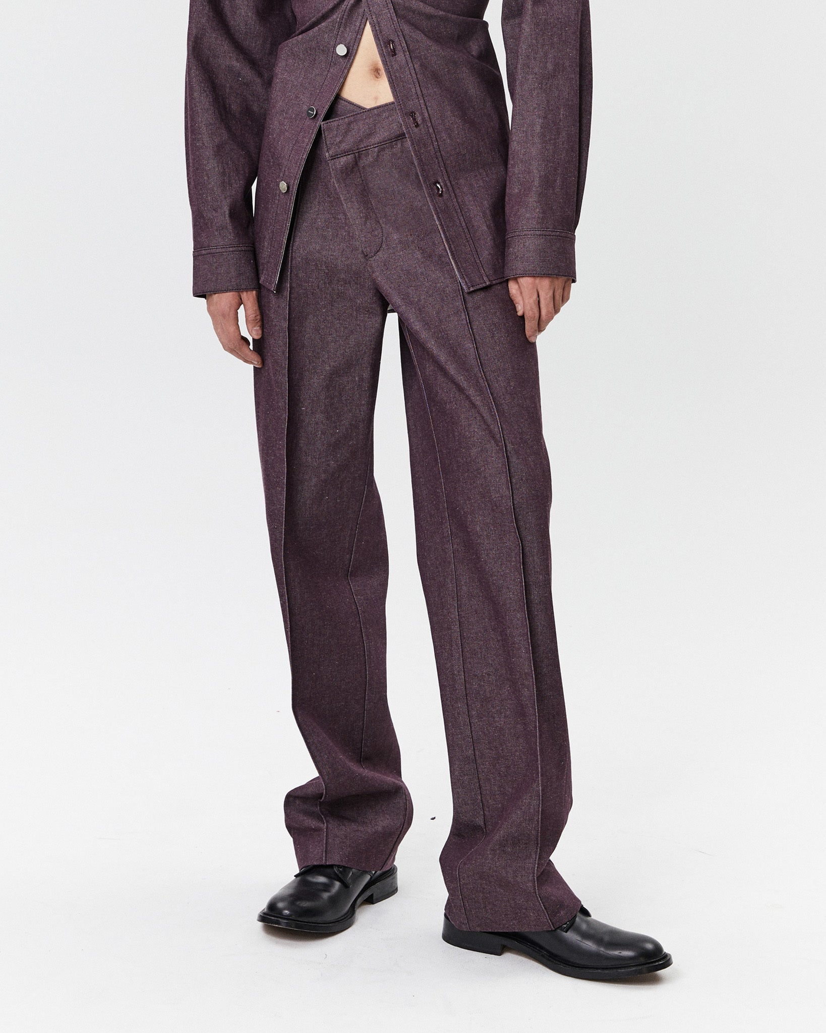 Straight leg jean with dip waistband and overlapping fly for an extra sexy suggestion. Featuring pintuck detailing on front leg and in yoke pockets.